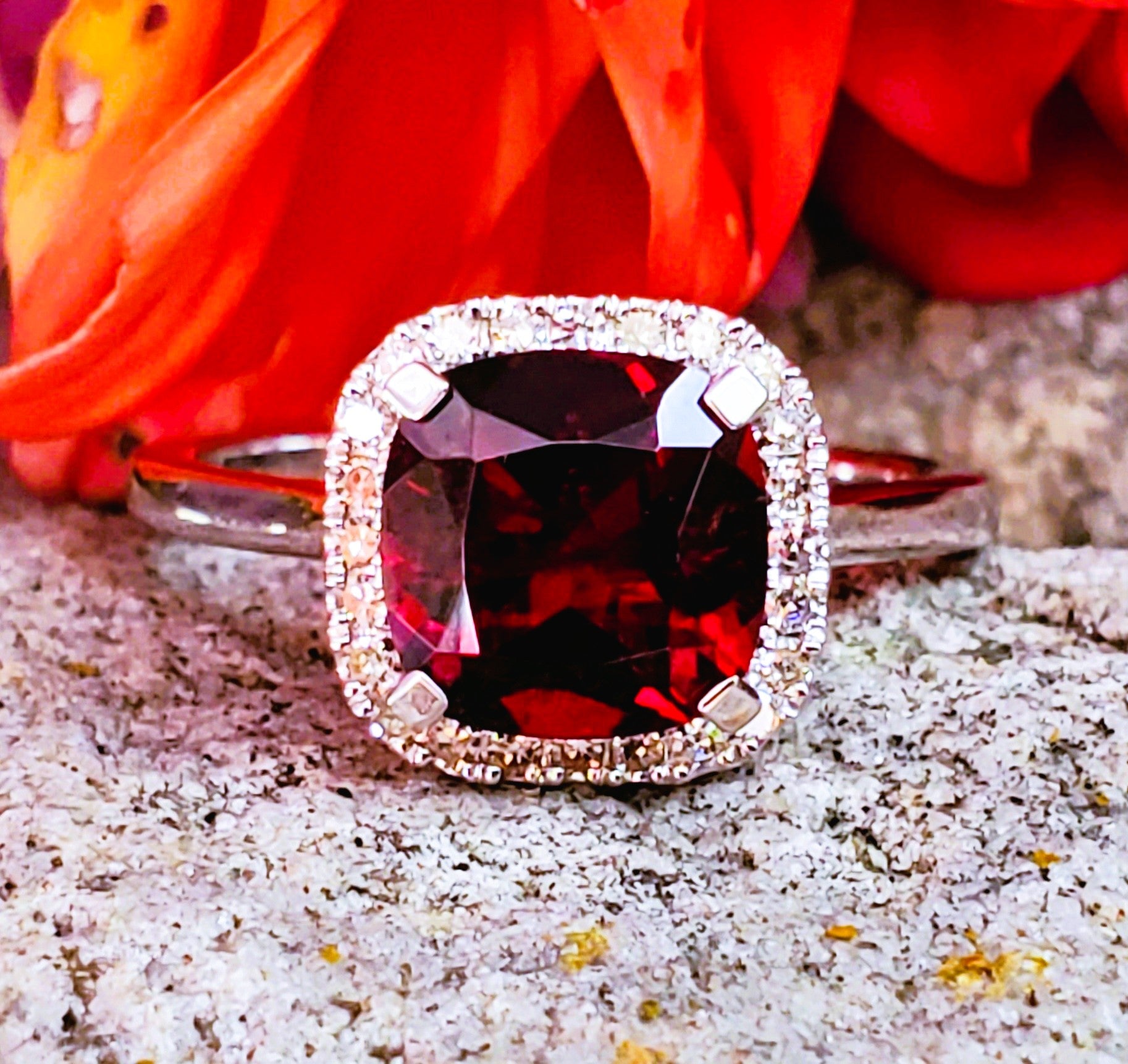 This 10 Karat White Gold ring features a beautiful cushion cut Garnet surrounded by sparkling Diamonds. Crafted with expert workmanship and elegance, this ring effortlessly combines luxury and sophistication. Perfect for special occasions or everyday wear, it will add a touch of glamour to any outfit.