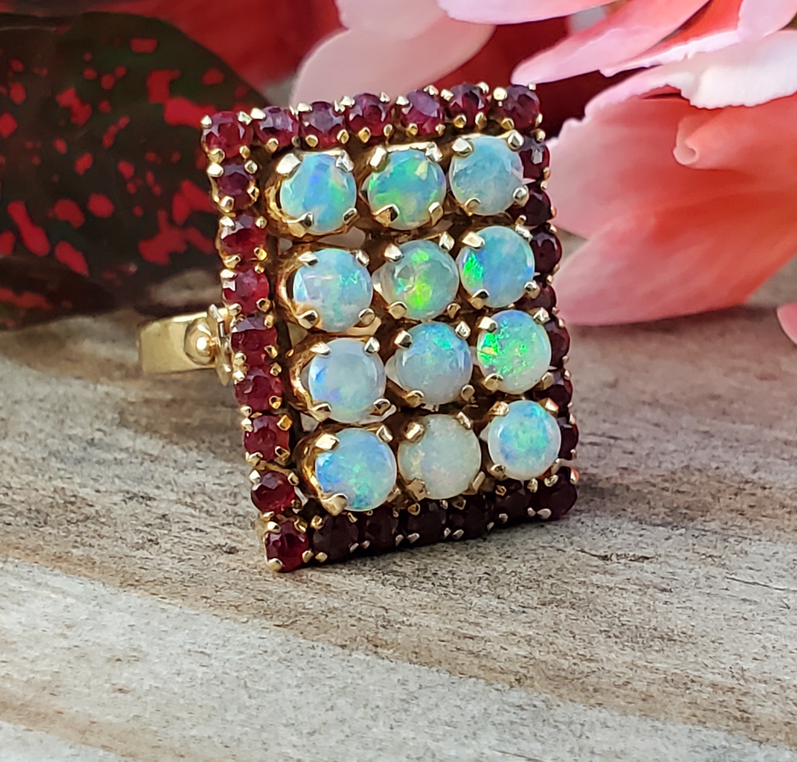 14k Yellow Gold Opal & Garnet Rectangle Ring. This ring is a part of our estate collection.