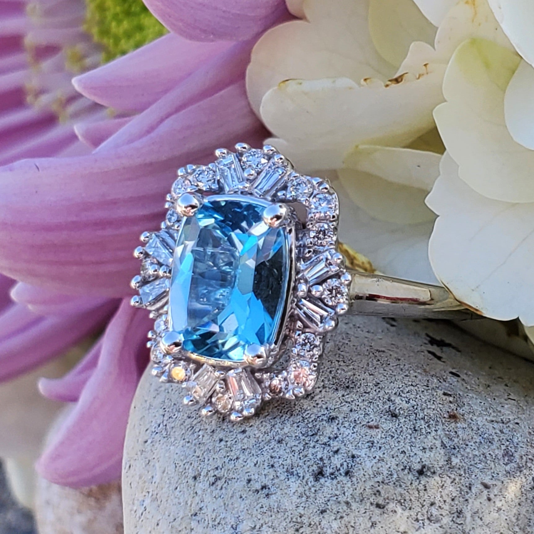 This 10 karat white gold ring is set with a gorgeous swiss blue topaz and .25 carat total weight in diamonds.  We also have the matching pendant.