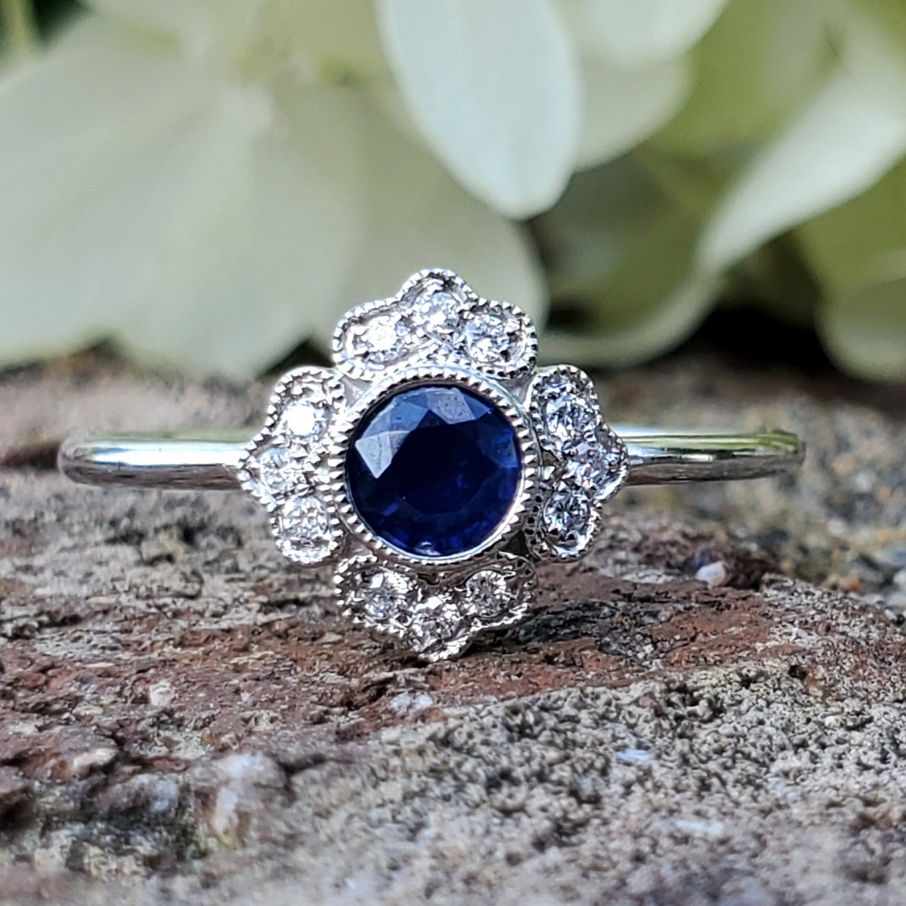 This exquisite 14K white gold ring showcases a stunning .07CTW diamond halo and round sapphire, evoking a vintage charm with its elegant and sophisticated design. It's a luxurious piece that exudes exclusivity, perfect for those with discerning taste in fine jewelry.