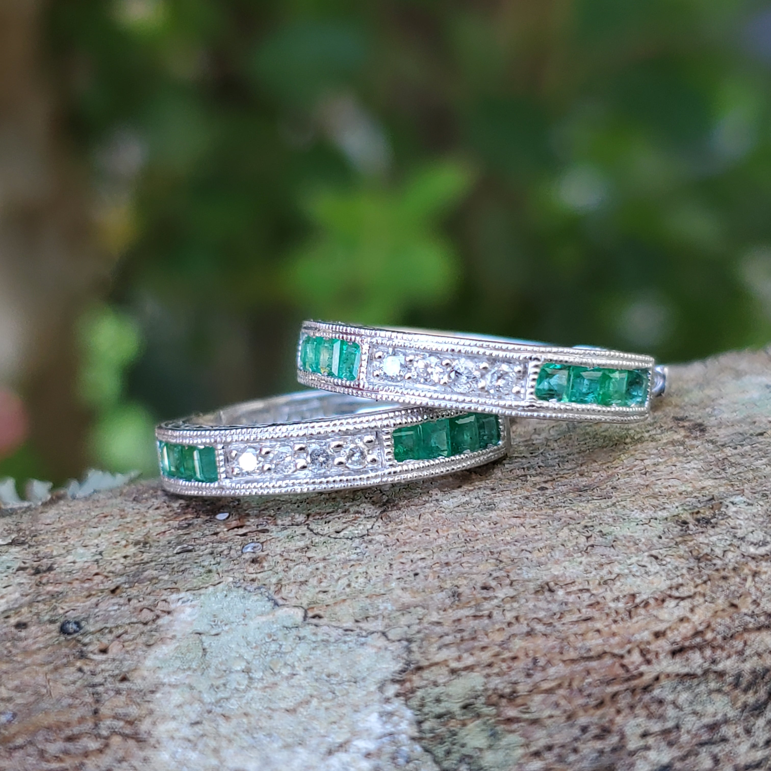 14K White Gold Emerald & Diamond Hoop Earrings. These earrings have a vintage look with hand engraving on the sides.