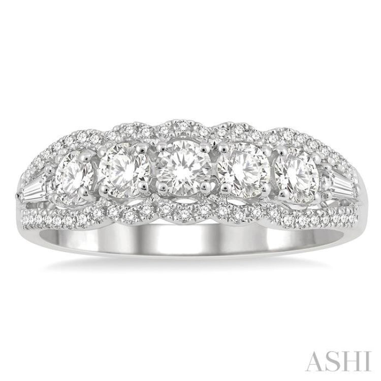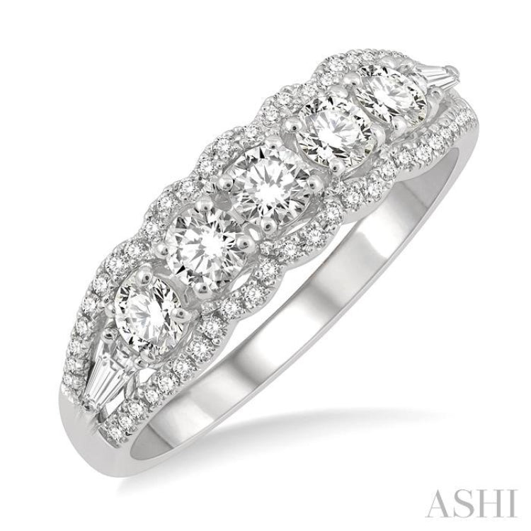 Fashion rings are meant to enhance your look. If they are diamond fashion rings like this here, they will certainly add glamour to any outfit. This fashion ring features a split shank that opens to house 5 large prong set round cut diamonds within its open split center. The borders are a curvy Lattice and fit closely with the center diamond row. A prong taper set baguette diamond each sits at the ends of the diamond setting, also within the split shank. The curvy border of the split shank is further beautified by 50 micro wall set round cut diamonds, 25 each on either side. The ring is styled in 14 karat white gold. Total diamond weight is 3/4 Ctw.