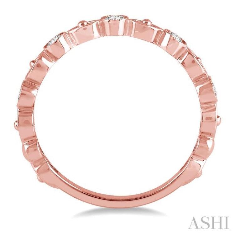 Stackable bands are fashionable and lend a fuller look when stacked together in four or more layers. They offer a grander look than a single ring worn on the finger. This awesome lattice diamond stackable band features a distinctive design, with an array of carved marquise and round mounts aligned in a straight line. There are 5 round mounts, each embellished with a bezel set round cut diamond. The circular mounts are further beautified by a milgrain border. The stack band is styled in 14 karat rose gold. Total diamond weight is 1/5 Ctw.