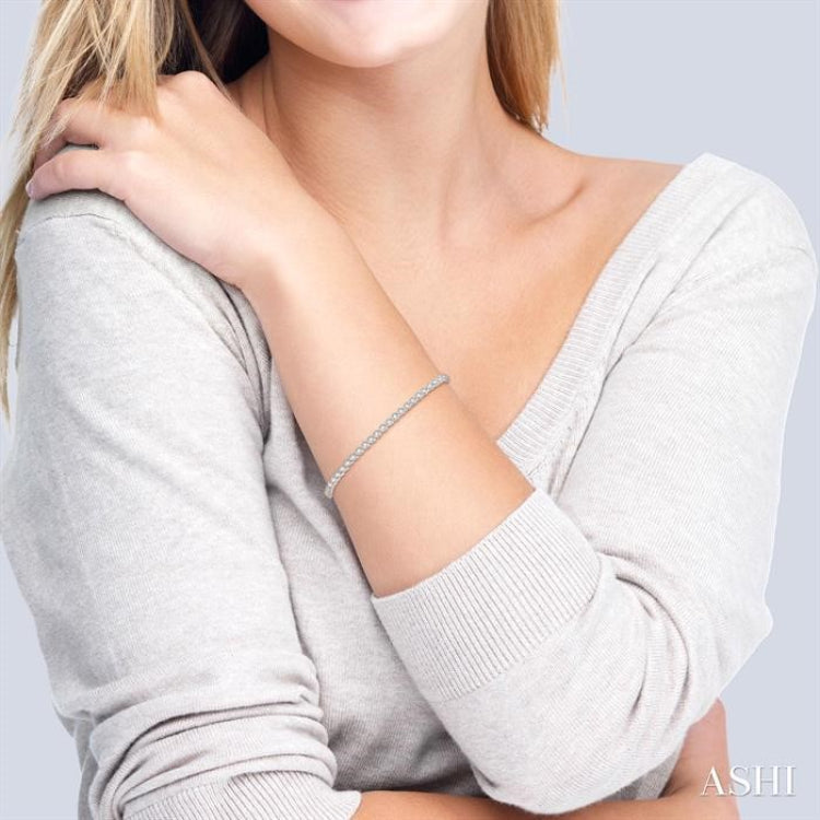 If you are looking for glamour and beauty, then this mesmerizing diamond tennis bracelet is what you should check out. This dazzling bracelet is perfect for any occasion and worth considering every bit. It features integrated triple prong link mounts, all the way from one end to the other. Each of the tri-prong mounts is embellished with a prong set round cut diamond. There is a total of 56 diamonds decorating the links. An open box clasp closure with a snap-in safety latch on the side completes the bracelet, which is fashioned in a rhodium finish 14 karat white gold. The total diamond weight is 3 Ctw.