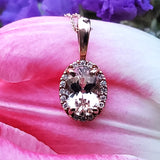 This 14 karat rose gold pendant is set with a stunning oval cut, peach morganite set in an oval shape diamond halo. Pair this beautiful pendant with one of our lovely morganite rings for a genuinely elegant look!