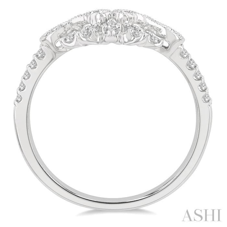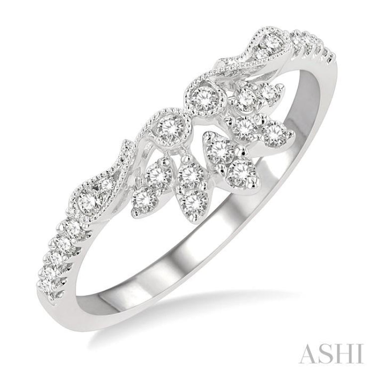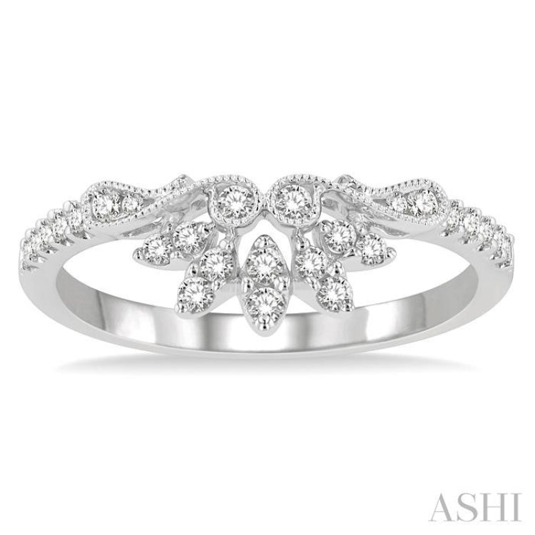 A skillfully crafted centerpiece makes the highlighting feature of this chic diamond wedding band. The striking centerpiece displays a layout of 5 marquise mounts, with circular mounts at their base and a leaf motif mount connecting the centerpiece to the shank. Total 6 bezel set round cut diamonds embellish the circular mounts, while the marquise and leaf motif mounts are decorated with a total of 10 prong set round cut diamonds. Adorning the shank are 5 each, total 10, prong set round cut diamonds on either side. A milgrain finish is seen on the circular and leaf motif mounts. The wedding band is carved in 14 karat white gold. Total diamond weight is 1/4 Ctw.